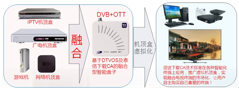 泰信基于下載CA延伸出DTVOS直播電視操作系統和虛擬機頂盒軟件及融合機頂盒硬件產品。其中,融合型智能機頂盒——泰信盒子,融合有線電視和網絡電視,實現全國跨區域市場化銷售,受到廣大用戶的廣泛歡迎。全國80%以上地區的老百姓終于有了自主選擇有線電視機頂盒的權利!解決了百姓看電視的煩心事兒。