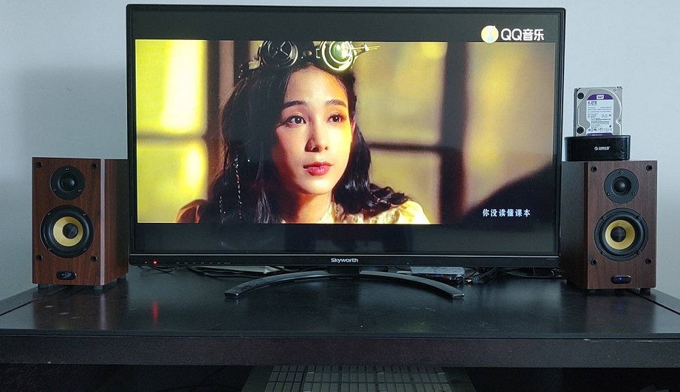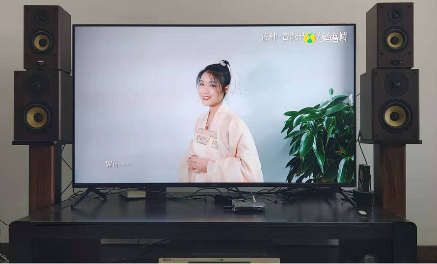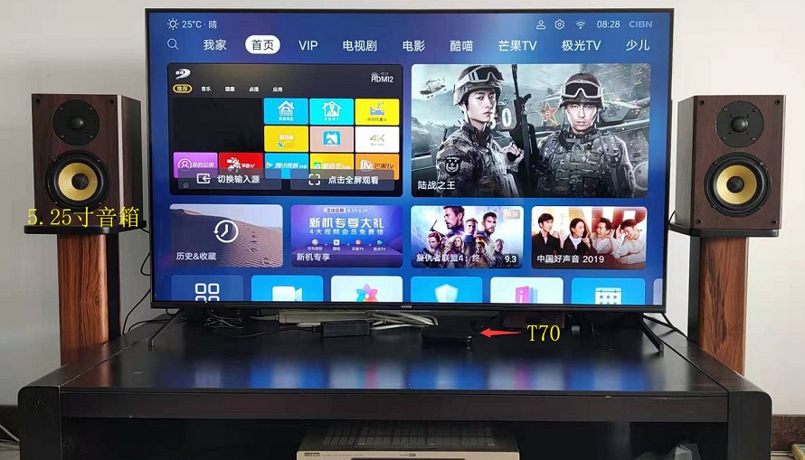 T6K+4寸音箱、T70+5.25寸音箱與智慧屏的同框照片。上面兩只小音箱是T6K,中間兩只大音箱是5.25寸的無源音箱與放在電視柜上的T70組合。