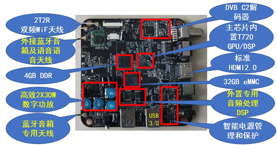 從硬件配置上可以看到T70功能的高度集成,黃色的標識都與聲音有關。可見,與現在的電視和機頂盒相比,提高的可不止一點點。