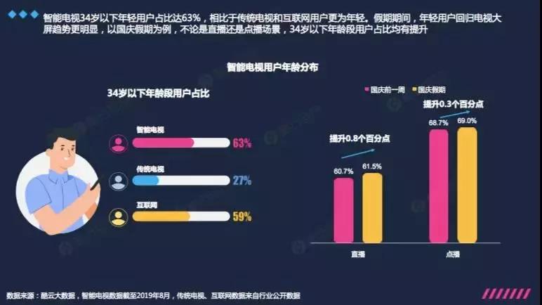假期期間,年輕用戶回歸電視大屏趨勢更為明顯。以國慶假期為例,期間直播、點播年輕用戶皆有所增長,分別提高0.8個百分點和0.3個百分點,“70年閱兵”的隆重與盛大強勢拉動年輕用戶回歸,因為從傳播質量、公信力以及觀看體驗方面來看,電視依然具有無法撼動的權威地位。
