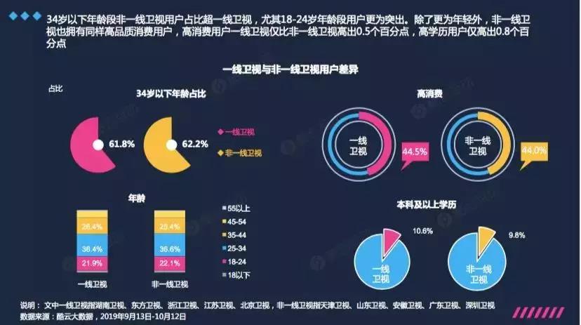 答案是肯定的。從用戶年齡上看,非一線衛視用戶年輕化程度甚至超越一線衛視,34歲以下用戶占比達到62.2%,超出一線衛視0.4個百分點。從消費能力上看,非一線衛視也不乏高消費用戶群體,9.8%高學歷用戶占比及44%的高消費人群占比,使非一線衛視同樣能夠滿足廣告主的投放需求,實現目標人群的精準覆蓋。