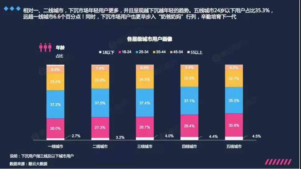 提起北京、上海、深圳這些大城市,人們的固有印象大多是在外打拼的年輕人格外多。但事實果然如此嗎?《報告》數據顯示,相對一、二線城市,其實下沉市場的年輕用戶反而更多,且呈現出越下沉越年輕的趨勢。也就是說,我們認知中下沉市場年輕人缺失、老人與孩童留守的印象其實并不正確。