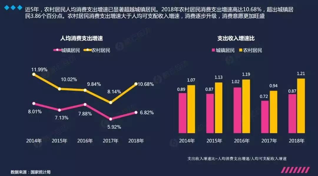 只賺錢不花錢再也不是下沉市場用戶的標配,拼多多的崛起見證著下沉市場用戶巨大的消費潛力。近5年來,農村居民人均消費支出增速已明顯超越城鎮居民,2018年農村居民消費支出增速高達10.68%,超出城鎮居民3.86個百分點。