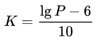 卡爾達(dá)舍夫等級(jí)用一個(gè)對(duì)數(shù)公式表示。如果一個(gè)文明的全部能源消耗為P,那么這個(gè)文明對(duì)應(yīng)的卡爾達(dá)舍夫等級(jí)K可以表示為: